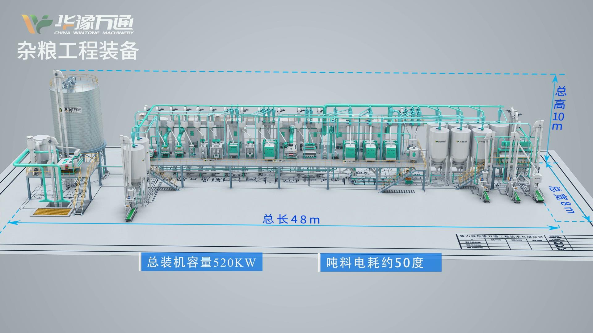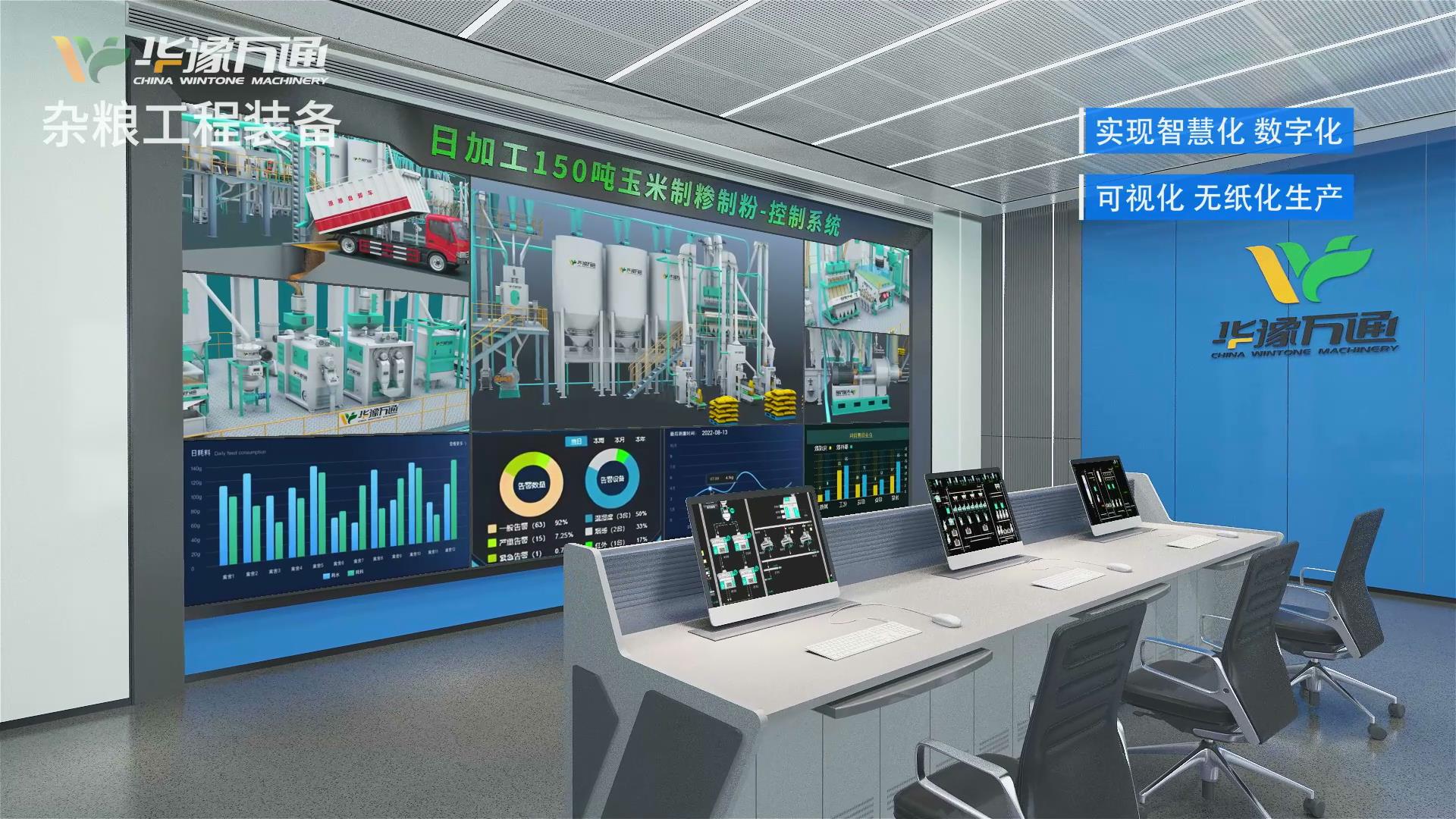 華豫萬通日加工150噸玉米制糝制粉創(chuàng)新工藝,設計為兩層平臺結構,三層設備布置,總長48m,寬8.0m,高10m,總裝機容量520kw,噸料電耗約50度,糝粉總收率≥65,糝內目測無皮、無黑星,粉內無麩皮,遠超國家標準。配備PLC智能化控制,可實現智慧化,數字化,可視化,無紙化生產。