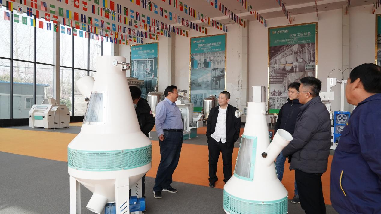 走進(jìn)中試車間,考察團(tuán)觀摩了公司的脫皮機(jī),胡軍營(yíng)工程師講解了設(shè)備的產(chǎn)能、用途、原理,與考察團(tuán)進(jìn)行了深入的互動(dòng)交流??疾靾F(tuán)領(lǐng)導(dǎo)對(duì)華豫萬(wàn)通在糧機(jī)行業(yè)的執(zhí)著與創(chuàng)新表示贊許。